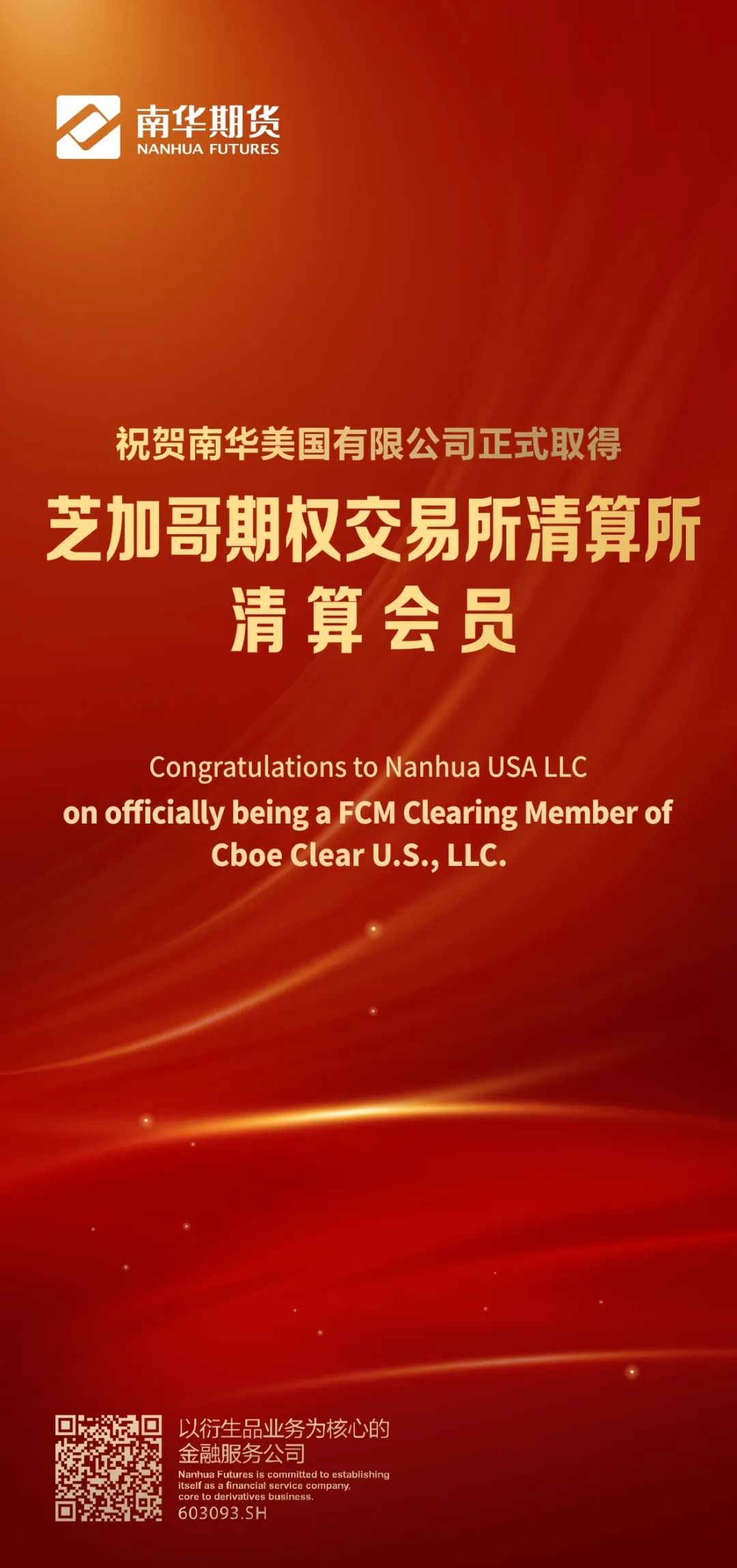 美國時間 2025 年 7 月 7 日,南華美國有限公司(以下簡稱“南華美國”)被正式批准成為芝加哥期權交易所清算所(Cboe Clear U.S., LLC.)的清算會員。這是南華美國目前擁有的第8個清算資質,標誌著南華期貨國際化戰略佈局再進一步。