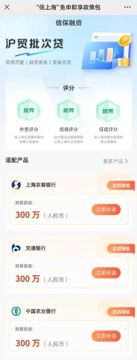 企业可以通过上海单一窗口信保专区授权并领取额度,也可通过上海随申办小程序“随申兑”专区领取“信上海”免申即享政策包。