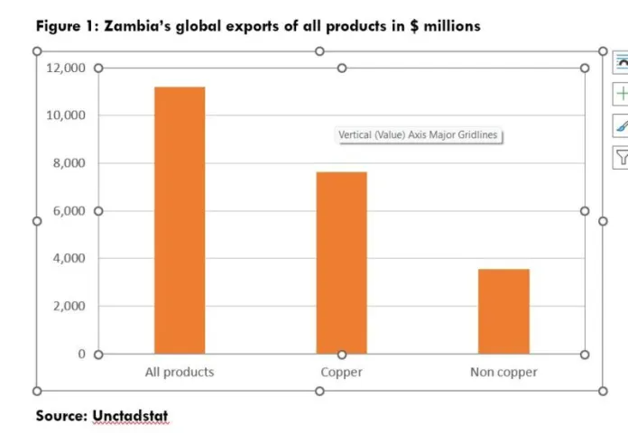 My findings are shown in Figure 2. Yes, in terms of height, the lines in the graph going up imply that non-copper exports have been growing substantially. If percentages are used, it would show similar or the same image seen here, in terms of high lines. No wonder, those like me, familiar with government reporting on non-cooper or non-traditional exports beam with excitement and say, “Zambia’s non-traditional exports increase by 20%; Zambia’s non-traditional exports jump….”