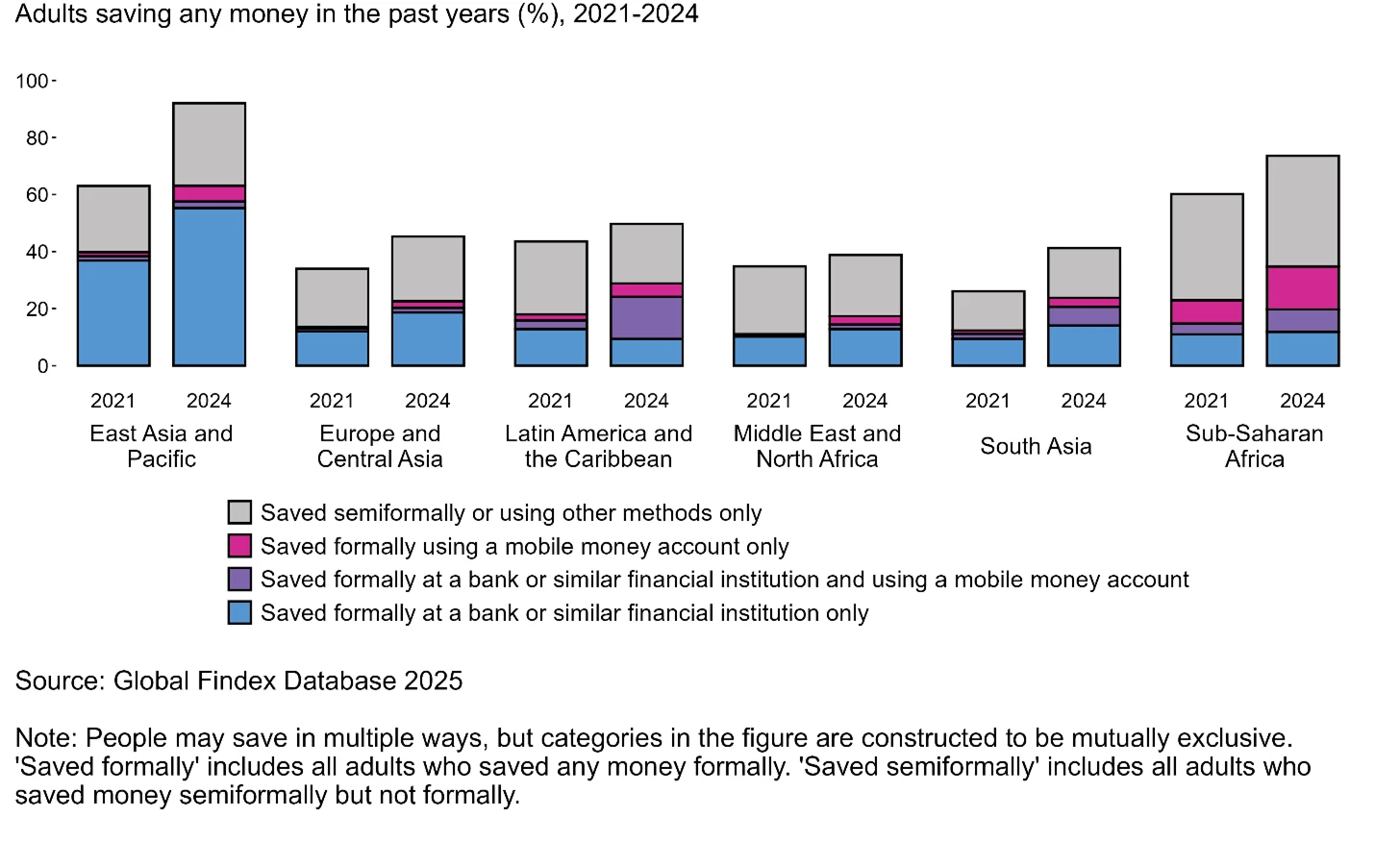 Formal saving has surged, enabled by digital accounts, breaking a long-term trend of slow growth in the share of adults who save. As of 2024, 40 percent of adults in low- and middle-income economies saved using an account, an increase of 16 percentage points more than in 2021. In both Latin America and the Caribbean and Sub-Saharan Africa, the share of adults saving using mobile money increased by more than 10 percentage points, totaling 19 and 23 percent of adults, respectively (figure 2).