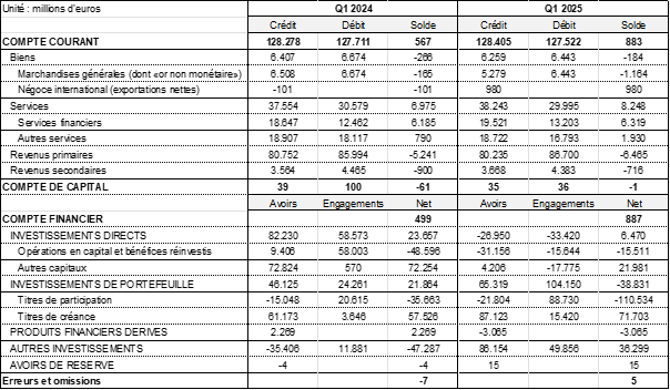 與2024年第壹季度相比,2025年第壹季度國際服務貿易差額增長了18%(12.73億歐元),這可以用出口增長1.8%而進口下降1.9%來解釋。事實上,非金融服務貿易的出口(-1.0%)和進口(-7.3%)均有所下降,使非金融服務的順差大於2024年第壹季度。與此同時,金融服務的國際貿易錄得穩健增長,出口增長4.7%,進口增長5.9%。這壹變化主要是由於2025年第壹季度投資基金管理的平均資產與2024年第壹季度相比增加了(9%)。