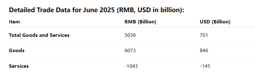 In June 2025, China's international trade in goods and services reached RMB 4221.4 billion, marking a 6% increase compared to the same period last year. The trade consisted of goods exports totaling RMB 2118.5 billion and imports of RMB 1511.2 billion, generating a surplus of RMB 607.3 billion. Services showed a deficit of RMB 104.3 billion, with exports of RMB 243.7 billion and imports of RMB 348.0 billion.