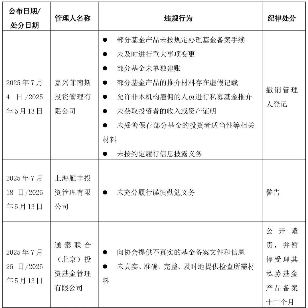 2025年7月4日和7月11日,中國證券投資基金業協會(“協會”)分別發布公告稱,深圳龍鱗私募證券投資基金管理有限公司、廣東盈瀚投資有限公司等6家私募基金管理人存在異常經營情形,且未能在書面通知發出後的3個月內提交符合規定的專項法律意見書,協會將註銷該6家機構的私募基金管理人登記。