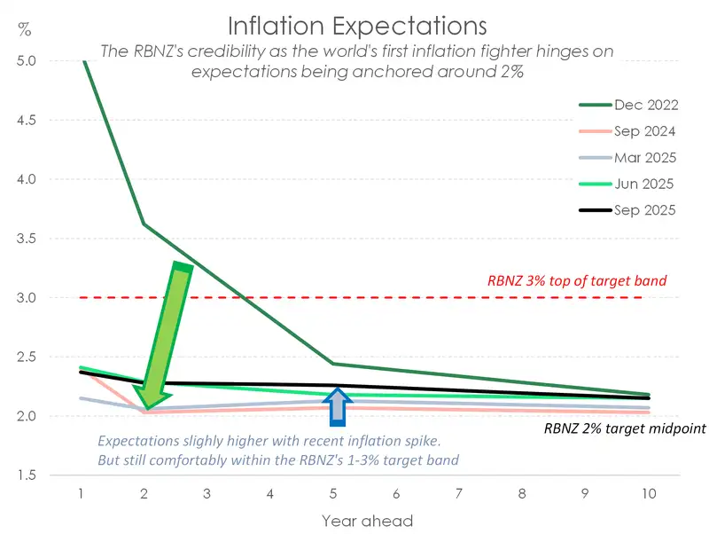 Inflation expectations tend to follow actual inflation. So when we saw the headline rate accelerate from 2.5% to 2.7% over the June quarter, it was almost a given that we’d see a lift across inflation expectations. That wouldn’t have gone down too well at the RBNZ. Remember the 5-1vote at the May MPS? The argument to hold rates was grounded in concerns around rising inflation expectations. Thankfully, the latest round of the RBNZ's survey of inflation expectations showed expectations comfortably contained within the RBNZ's 1-3% target band.