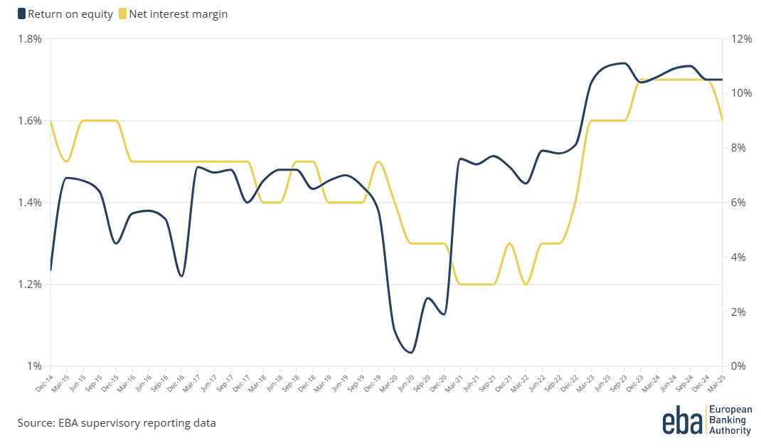 歐洲銀行管理局風險儀表盤顯示,盡管風險成本上升,但 2025 年第壹季度的監管數據顯示歐盟/歐洲經濟區銀行業依然穩健