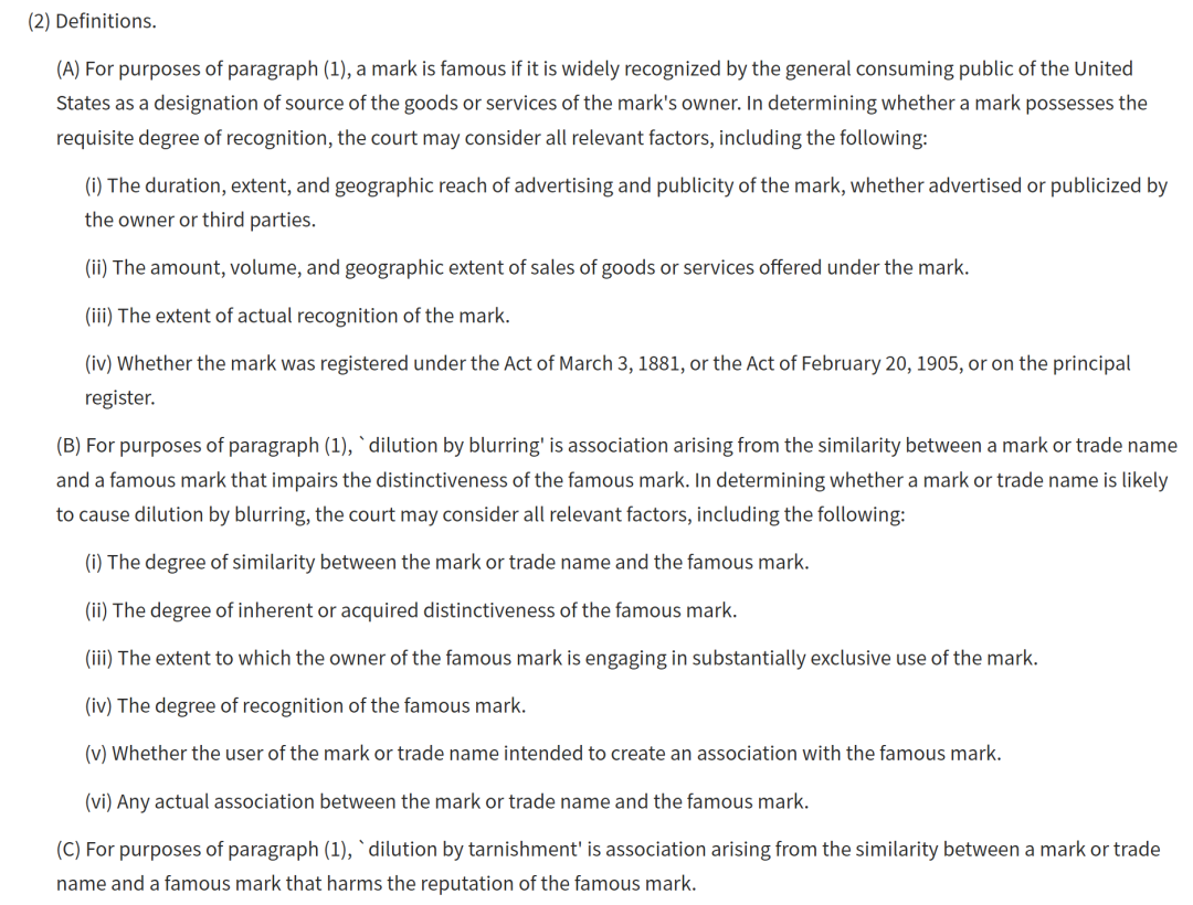 15 U.S.C. § 1125(c) 的保护对象明确包括“trade dress(商业外观)”。这意味着,理论上,一个极其著名(famous) 且具有固有显著性(inherently distinctive)的商业外观,即使他人是在完全不相关的产品或服务上使用相同或近似的设计,且不存在任何混淆可能性,也可能依据淡化理论主张权利,防止其独特性被弱化或声誉被玷污。
