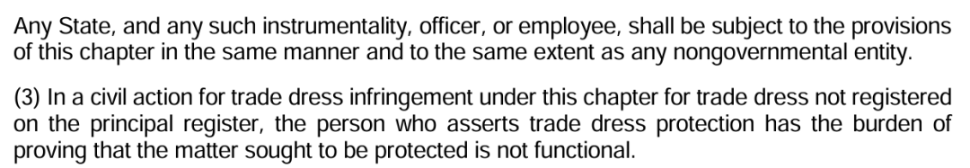 (3)在本章下针对未在主要登记簿上注册的贸易外观提起的侵权民事诉讼中主张贸易外观保护的一方有责任证明所寻求保护的事项不具有功能性。