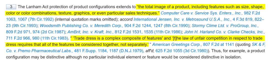 商业外观(Trade Dress),依美国判例(Duraco Products, Inc. v. Joy Plastic Enterprises, Ltd., 40 F.3d 1431, 1439 (3d Cir. 1994))之释义,《Lanham Act(兰哈姆法)》对产品结构的保护延伸至产品的整体形象,包括尺寸、形状、颜色或颜色组合、纹理、图形甚至特定销售技术等特征。