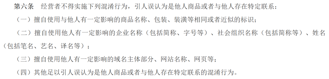 第六条 经营者不得实施下列混淆行为,引人误认为是他人商品或者与他人存在特定联系: