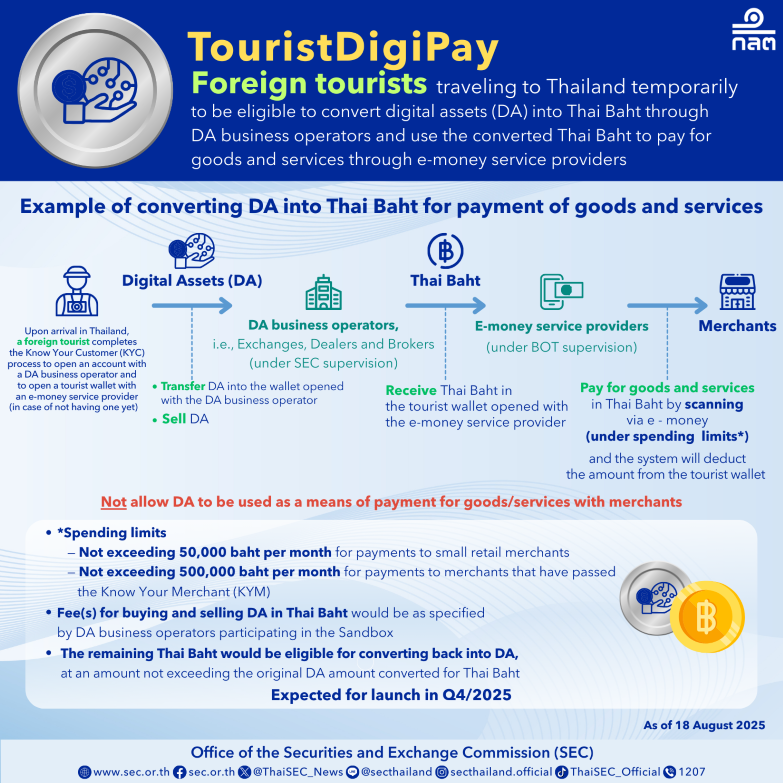 SEC and three partners co-launch an 18-month TouristDigiPay sandbox for foreign tourists to convert digital assets to Baht for spending in Thailand