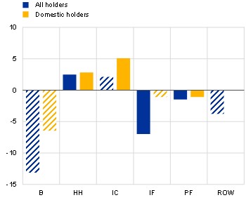 Notes: The chart shows the effects across investors of a euro sovereign stress shock of 1 standard deviation on holdings of sovereign debt from countries vulnerable to being closely watched by financial markets, on impact (panel a) and for the average effect over the first four quarters (panel b). Blue (yellow) bars indicate point estimates for all (only domestic) holders. The striped bars indicate that effects are not statistically significant at the 10% level. The estimates are obtained from security-level panel local-projection regressions run separately for each holder sector. Euro area holder sectors: B stands for banks; HH stands for households; IC stands for insurance corporations; IF stands for investment funds; PF stands for pension funds; ROW stands for rest of the world (non-euro area), consisting predominantly of internationally domiciled investment funds.