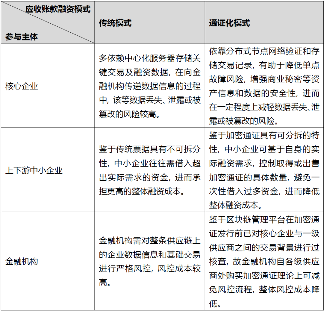 在上述場景下, 核心企業與壹級供應商所簽署的底層采購合同以及付款保函均通過數字化得以在整條供應鏈上流動。相較於傳統模式, 通證化場景下的應收賬款融資呈現出以下特點: