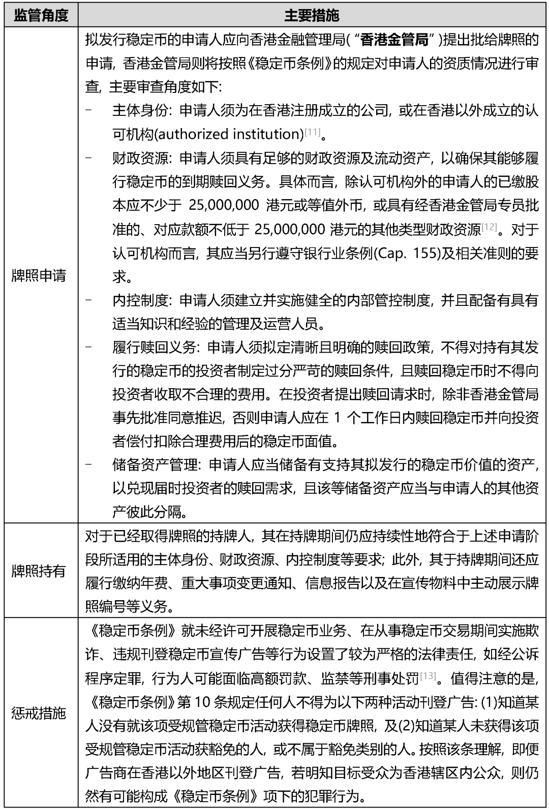 《穩定幣條例》對於穩定幣應用的監管主要從發行人入手, 引入嚴格的發牌制度, 對穩定幣發行人申請牌照以及持有牌照均設置了明確的要求, 並輔以相應的懲戒措施, 所涉要點如下: