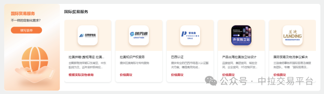中拉交易平台综合服务中心是支撑中拉产业合作纵深发展的关键基础设施,致力于破解企业跨境落地中的“服务碎片化”与“信任缺失”难题。平台系统整合中拉两地法律、财税、物流、认证等专业资源,构建覆盖企业出海全周期、全链条的服务协同网络。通过标准化接入、资质核验与履约评价机制,实现服务资源的可信组织与高效配置,推动企业从“单点对接”向“一站式业务落地”升级,真正打通中拉经贸合作的“能力落地通道”。