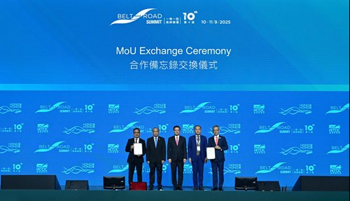 Mr John Lee, Chief Executive of HKSAR Government (centre) witnessed Mr Christopher Hui, Secretary for Financial Services and the Treasury of HKSAR Government and Dr King Au, Executive Director, FSDC, exchanging the Memorandum of Understanding with Dr Ibrahim Kholilul Rohman, Head, IFG Progress and Mr Yul Edison, Indonesian Consul-General in Hong Kong, at the MoU Exchange Ceremony of the Belt and Road Summit