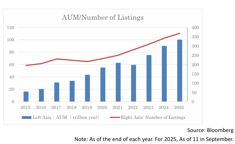 很高興宣布,東京證券交易所(TSE)上市ETF的資產管理規模(AUM)已突破100萬億日元。 自1995年日本首只ETF上市以來,東京證券交易所ETF市場在資產凈值和上市數量方面持續增長。 東京證券交易所將繼續通過豐富產品陣容、推進投資環境建設來促進ETF市場發展,使投資者能更有效地進行資產配置。衷心感謝各位壹直以來的支持。