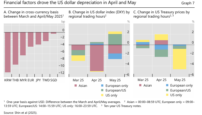 Unexpected US Dollar Depreciation Acts as a Global Release Valve: Contrary to typical trade model predictions of dollar appreciation, the US dollar depreciated following the tariff announcements. Maechler stressed this was primarily driven by financial behavior, not trade factors—specifically, hedging operations by international investors managing the exchange rate risk of their large US dollar asset holdings significantly influenced the spot rate (Graph 7). A weaker dollar alleviated global pressure in two ways: by improving the balance sheets and risk appetite of global US dollar investors, and by reducing the local currency cost of imports elsewhere, providing more policy space for relevant central banks.