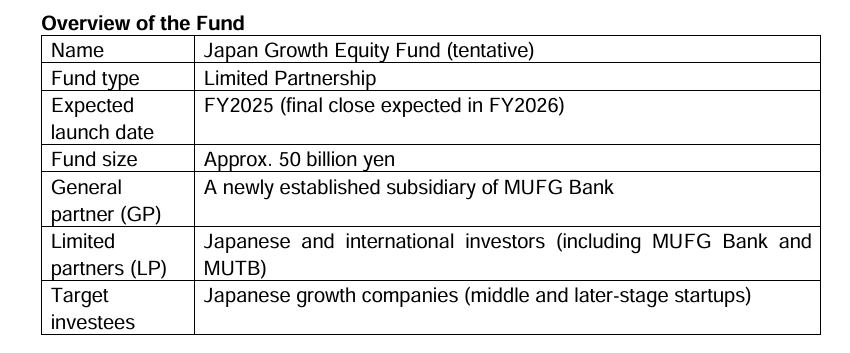 Mitsubishi UFJ Financial Group, Inc. (MUFG), MUFG Bank, Ltd. (MUFG Bank), and Mitsubishi UFJ Trust and Banking Corporation (MUTB) today announced that they would establish an equity fund (the Fund) to principally invest in middle and later-stage startups (growth companies) in Japan.