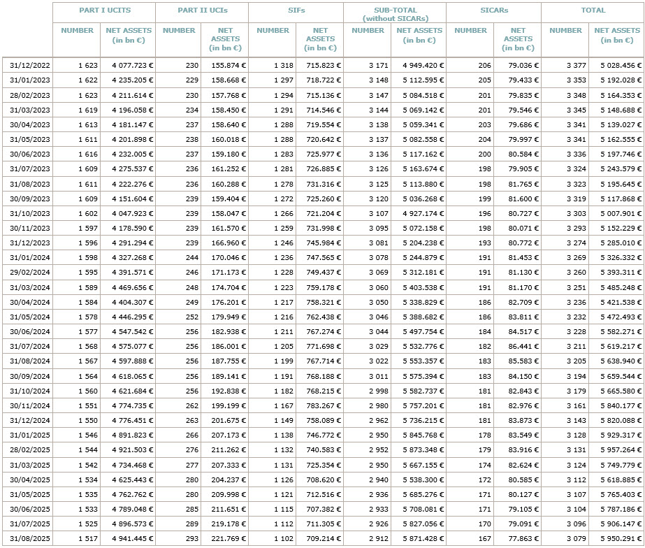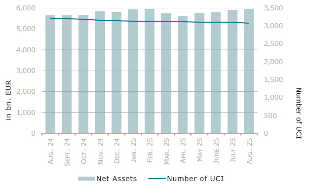 As at 31 August 2025, the total net assets of undertakings for collective investment, comprising UCIs subject to the 2010 Law, specialised investment funds and SICARs, amounted to EUR 5,950.291 billion compared to EUR 5,906.147 billion as at 31 July 2025, i.e. an increase of 0.75% over one month. Over the last twelve months, the volume of net assets increased by 5.52%.