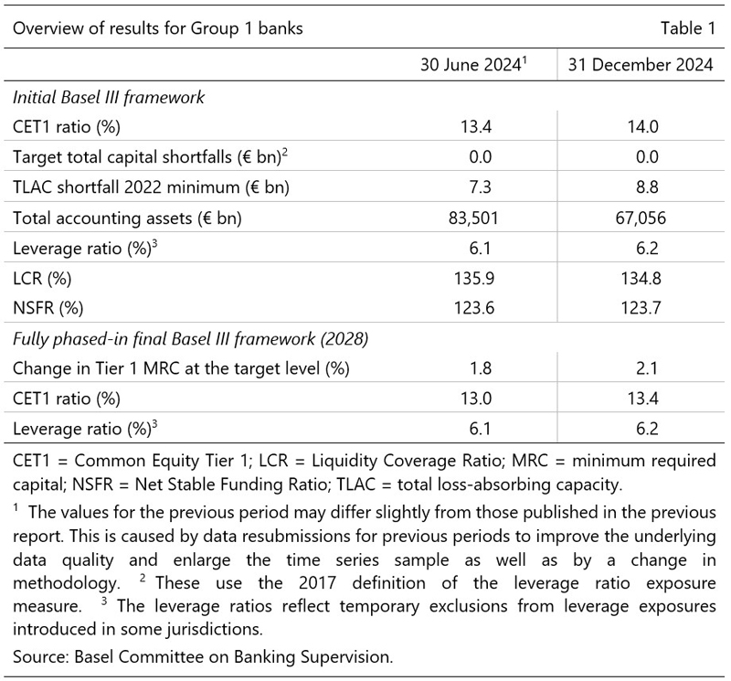 The report, based on data as of 31 December 2024, sets out trends in current bank capital and liquidity ratios and the impact of the fully phased-in Basel III framework, including the December 2017 finalisation of the Basel III reforms and the January 2019 finalisation of the market risk framework. It covers both large internationally active banks (Group 1) and other smaller banks (Group 2). See note to editors for definitions.