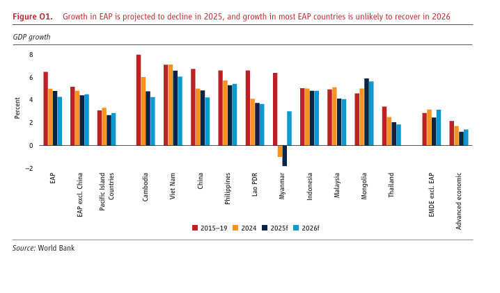 The World Bank’s October 2025 East Asia and Pacific Economic Update projects regional growth of 4.8 percent this year, down slightly from 5.0 percent in 2024. Viet Nam leads at 6.6 percent growth, followed by Mongolia (5.9 percent) and the Philippines (5.3 percent). China, Cambodia, and Indonesia are each projected to grow at 4.8 percent, while Pacific Island countries are projected at 2.7 percent, and Thailand at 2.0 percent.