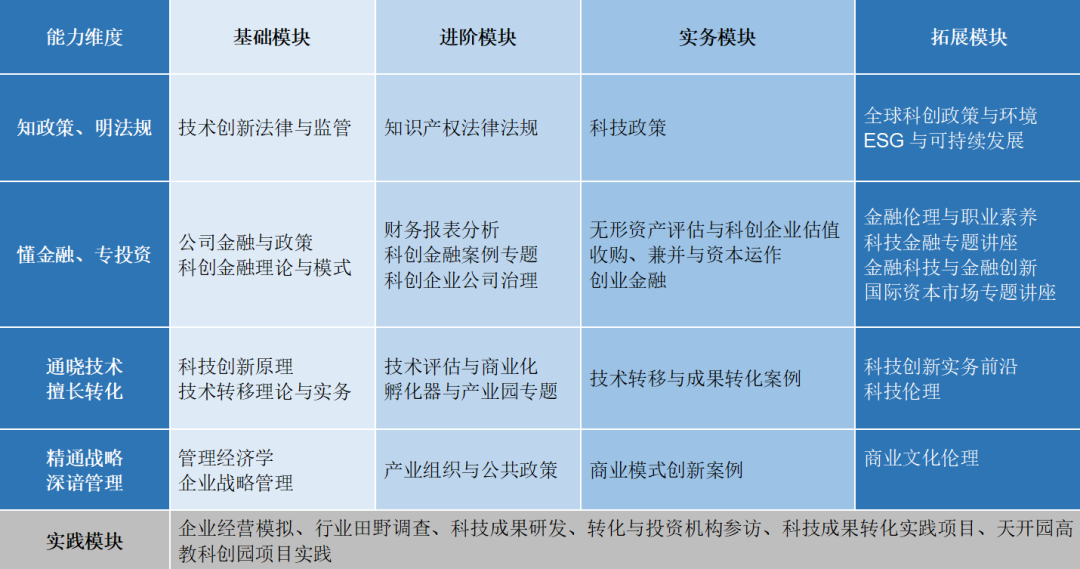 技术转移硕士培养体系将全面涵盖科创金融理论与实务、技术转移理论、商业管理知识,以及技术转移与成果转化的实践技能。侧重“知政策、明法规”、“通晓技术、擅长转化”、“懂金融、专投资”和“精通战略、深谙管理”四个维度能力的培养。