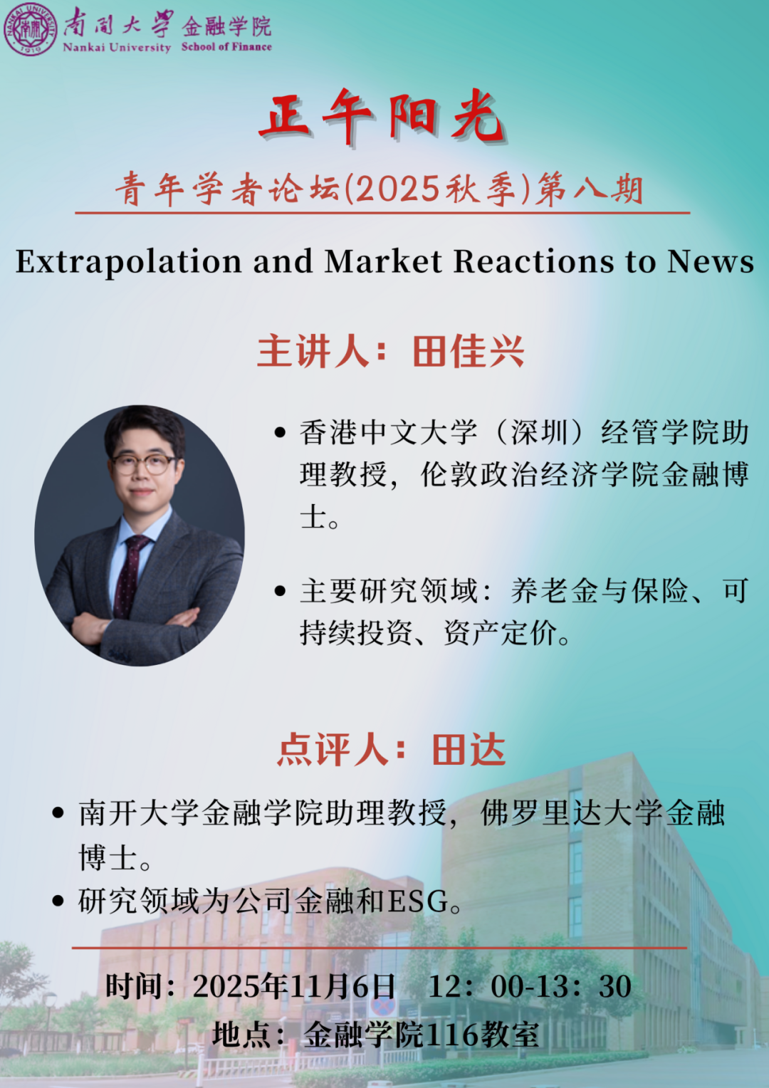 “正午阳光——青年学者论坛”是金融学院定期举办的以院内师生参与为主的学术交流活动,为全院专家学者之间、师生之间、南开金融与国际国内学术界之间提供了难得的交流机会。本学期“正午阳光”论坛初心不改,扬帆远航再出发,致力于营造学院学校科研氛围,推动师生学术科研水平不断提升!