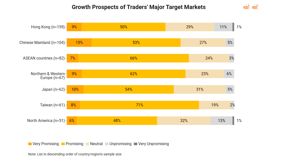 Hong Kong, Chinese Mainland and the ASEAN countries have emerged as the primary target markets for traders. This year, companies are demonstrating greater optimism regarding growth prospects across different markets. More than half of respondents believe that the outlook for all key selling markets is either promising or very promising, suggesting this positive sentiment is widespread rather than limited to specific regions. However, when it comes to North America, traders tend to adopt a more neutral perspective, with optimism likely tempered by the ongoing US tariffs policy.