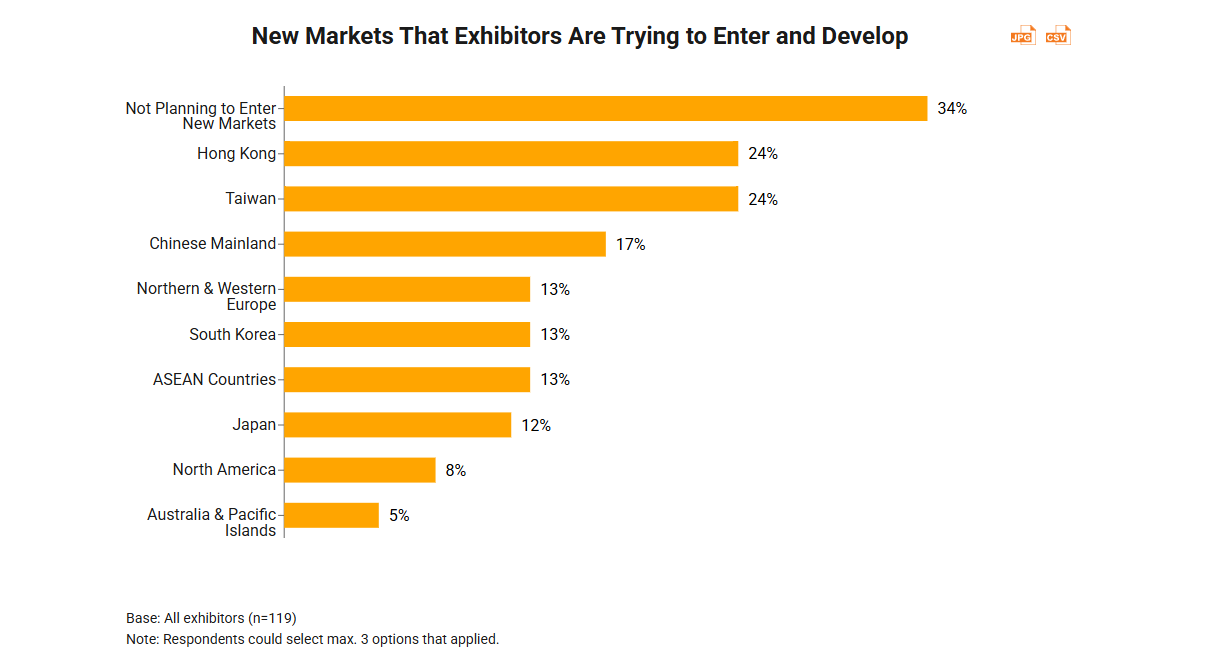 Amid slow global economic growth and heightened trade policy uncertainty, exhibitors are proceeding cautiously with their market expansion plans. Survey results indicate that 34% of respondents have no intention of exploring new markets. However, Hong Kong (24%), Taiwan (24%), and Chinese Mainland (17%) emerged as the top three destinations where exhibitors expressed interest in pursuing market development. Typically, Europe, Japan and the Americas are the usual new markets of interest for exhibitors. However, this shift in preference may be attributed to the increased presence of international brand exhibitors at this year’s event, many of which are not established in the Chinese market.