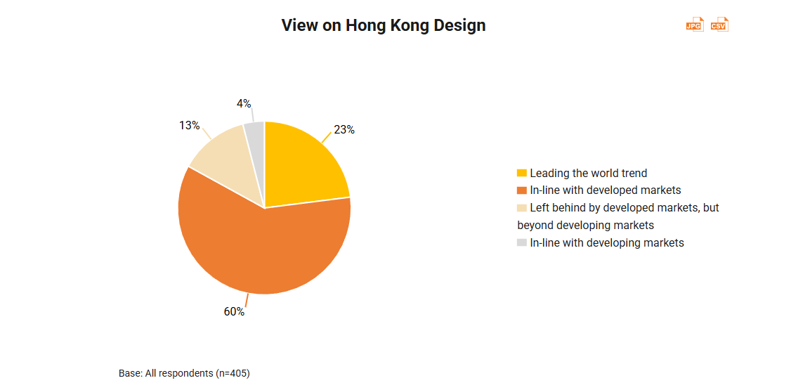 Overall, industry players are positive towards Hong Kong‑designed fashion products. While 60% of the respondents indicated that Hong Kong designs are on a par with those from developed markets, 23% revealed that these products are at the forefront of global trends. This reflects strong confidence in Hong Kong's fashion design sector and suggests it is steadily progressing towards becoming a global trendsetter.