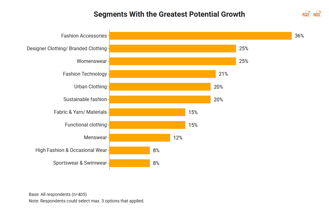 When respondents were asked which product category held the greatest potential for growth, fashion accessories emerged as the top choice, selected by 36% of participants. This continued preference underscores the enduring appeal of accessories, with consumers consistently seeking new ways to enhance their personal style and express their individuality.