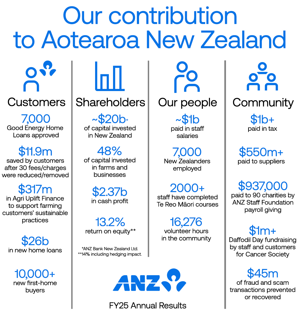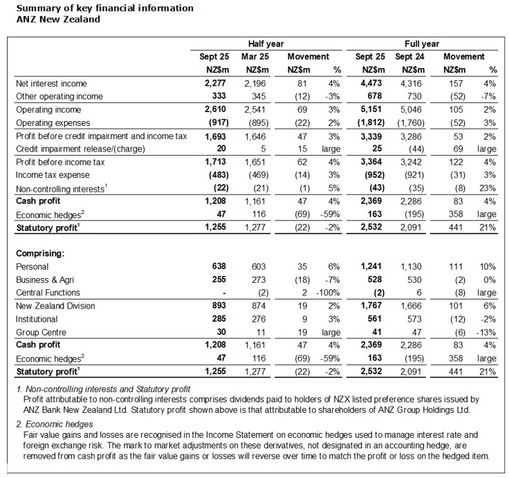ANZ New Zealand[1] (ANZ NZ) today reported a cash[2] net profit after tax (NPAT) of $2,369 million for the 12 months to 30 September 2025, up 4% on the prior year.