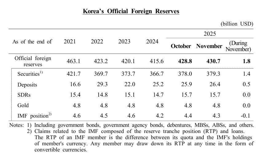 Korea's official foreign reserves as of the end of November 2025 amounted to 430.7 billion dollars.