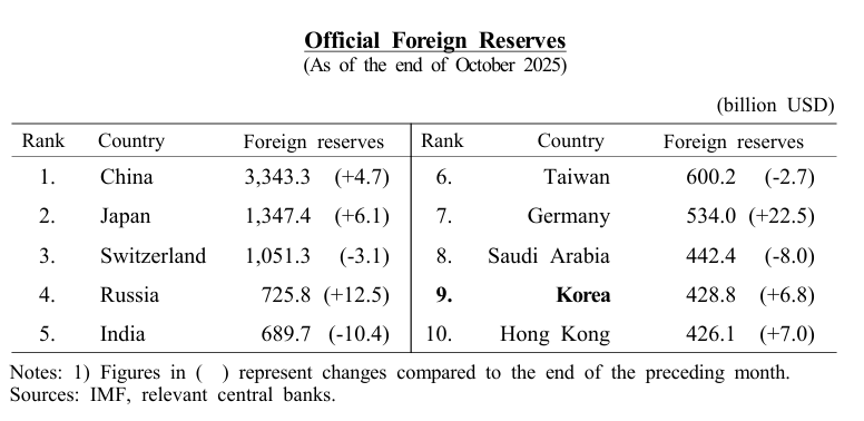 As of the end of October 2025, Korea's foreign reserve holdings ranked