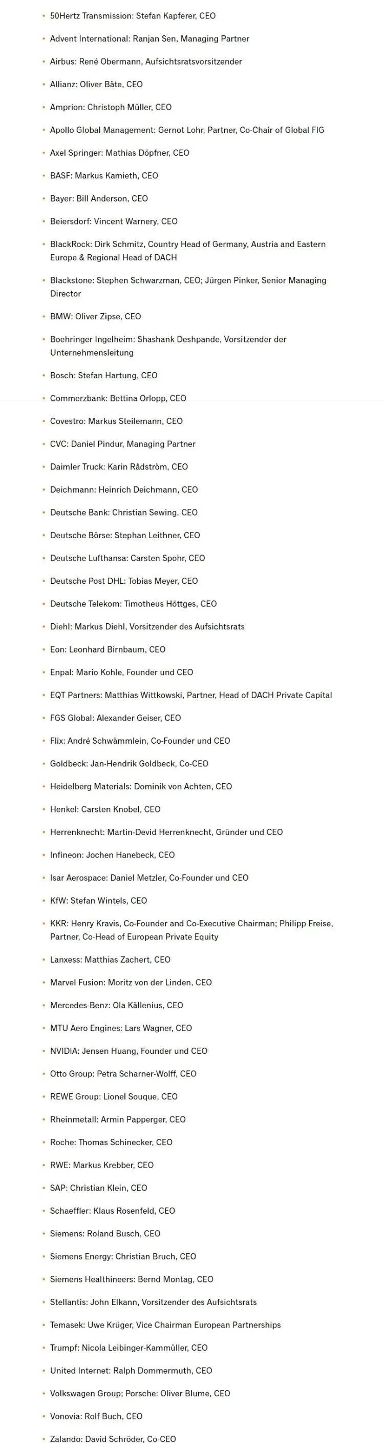 已确认加入该倡议的知名企业涵盖多个行业龙头,既有德国本土集团,如安联、宝马、德国交易所、奔驰、莱茵金属、SAP、大众,也包括美国科技与投资巨头英伟达、贝莱德和黑石等。
